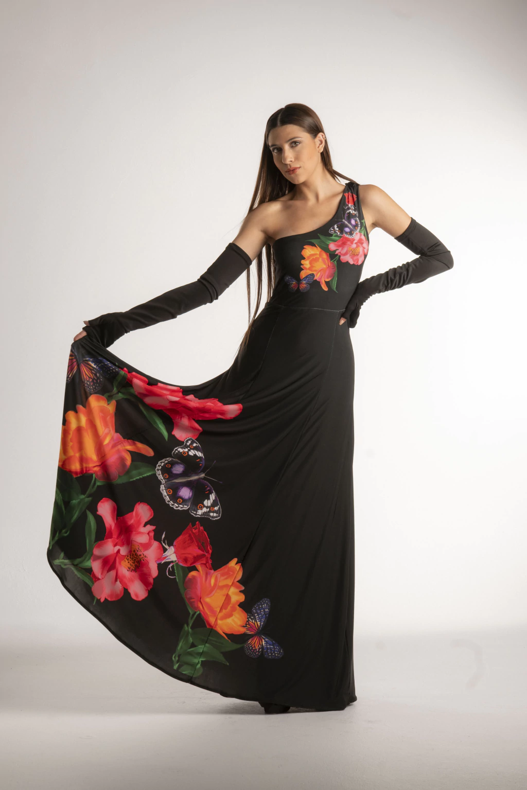 Su estampado de flores aporta un toque fresco y femenino, ideal para ocasiones especiales donde quieras destacar con un look moderno y romántico. El diseño cuenta con un escote asimétrico que añade originalidad y un aire contemporáneo, haciendo que cada detalle cuente.